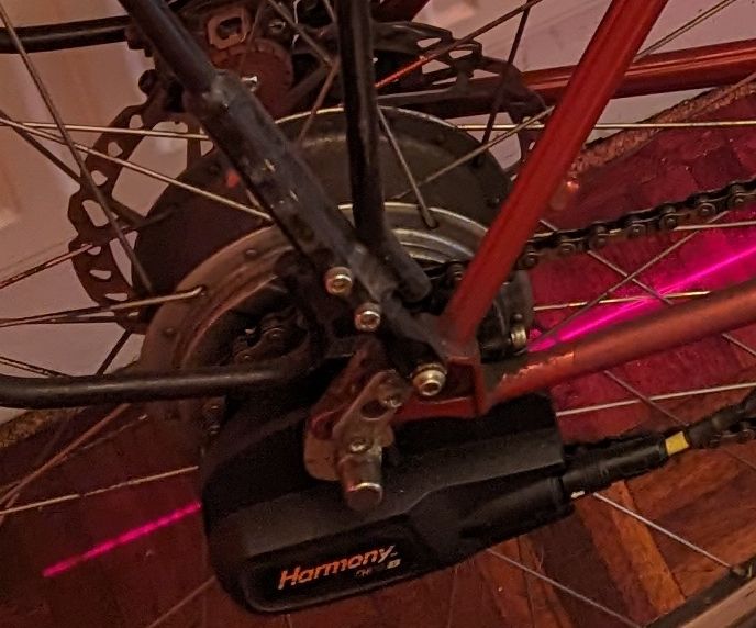 Besides what I've already described one other feature was added to the bike. The NuVinci continuously variable transmission, on the rear wheel, is usually adjusted, much like lots of bike gear systems, via a twist grip on the handle bars. If you want to play with something a little more fancy, however, NuVinci offer an electronic shifting system. Even more sophisticated is an electronic shifting system that is supposed to integrate with Bosch Ebikes. This is called the Harmony system and the idea is that it works to maintain a constant RPM at the front chain ring. If it gets too hard/easy to pedal, and the RPM changes as a result, then the Harmony automatically adjusts the gear ratio to compensate.
