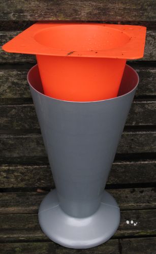 One vendor had some nice clear acrylic balls for sale that split down the middle so that they could be filled. These were a nice find as they were 30cm in diameter which was the exact size required and offered a nice level of surface finish. As to the inner sphere, the only thing I could find was a hamster ball. This wasn't pefect as it contained breathing holes, useful for the hamster, not so useful for me. These would need to be filled, but they were otherwise decent. A sports shop on ebay provided compact traffic cones, most likely used to mark out goal posts for street football, that would work very well as an internal cone and a flower shop some larger vases that would make for a very nice external cone.