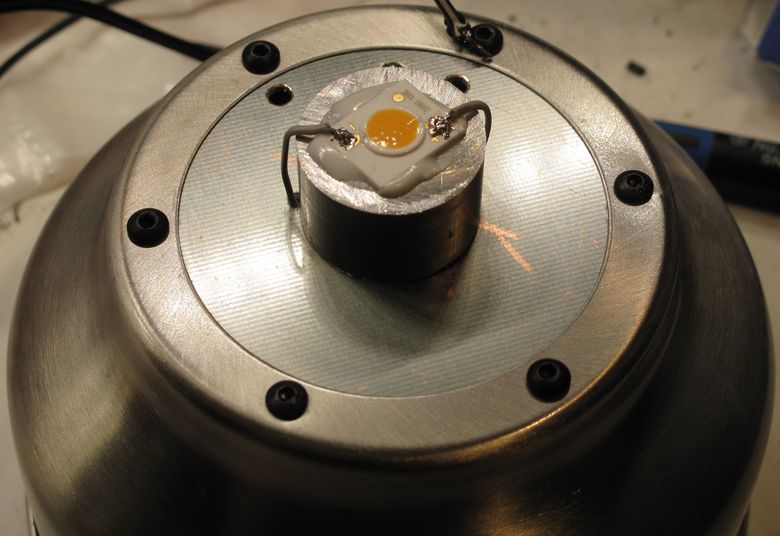 Adding an LED + driver would be a piece of cake, but some kind of diffuser would be necessary for a finished product. I figured that an oil lamp chimney, sprayed with some glass frosting, would make for an ideal companion to the metal base.